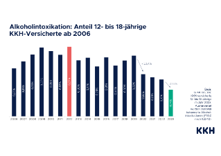 Noch nie wurden so wenige 12- bis 18-Jährige wegen exzessiven Alkoholkonsums im Krankenhaus behandelt wie im Jahr 2023. Laut Hochrechnung der KKH Kaufmännische Krankenkasse landeten im genannten Zeitraum bundesweit rund 7.650 Kinder und Jugendliche dieser Altersgruppe wegen einer akuten Alkoholvergiftung in einer Klinik. Das sind fast 28 Prozent weniger als 2022. Damit sind die Fälle von exzessivem, stationär behandeltem Alkoholkonsum bei Heranwachsenden nicht nur auf den niedrigsten Stand seit Beginn der KKH-Erhebung im Jahr 2006 gesunken, sondern von 2022 auf 2023 auch mit am drastischsten innerhalb eines Jahres. Nur von 2019 auf das Corona-Jahr 2020 verzeichnet die KKH mit gut 30 Prozent ein noch etwas stärkeres Minus. Seinerzeit fielen pandemiebedingt viele Trinkgelegenheiten wie Partys, Festivals und Konzerte weg – mit ein Grund für den damaligen Ausnahme-Rückgang beim Rauschtrinken.